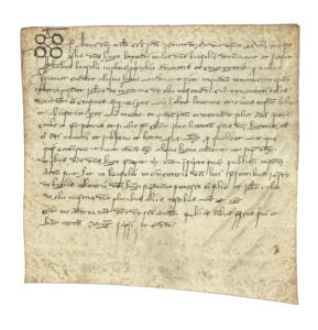 Manoscritti pergamenacei a inchiostro bruno. 4 fogli scritti al recto. Testi in latino. Scritture cancelleresche. Con signa tabellionum dei notai Andrea di S. Ambrogio, Andrea Iordano, Pietro Poysono di Susa. Dimensioni varie (la più grande 420x265 mm). (4)Le pergamene contengono atti notarili relativi alla zona di Bruzolo, nella bassa Val di Susa. La raccolta comprende: un bando che proibisce il taglio della legna nei boschi (la legna occorreva per alimentare una piccola fonderia in Bruzolo che lavorava il ferro); un atto in cui il castellano di Susa, per volere del conte Amedeo di Savoia (si tratta di Amedeo V di Savoia 1253-1323) libera da ogni obbligazione i figli di Ugone Bertrandi per il feudo di Bruzolo; una concessione di terre e un accensamento nel territorio di Bruzolo. Nelle pergamene è nominato il feudatario Ugone Beltrando, signore di Bruzolo.