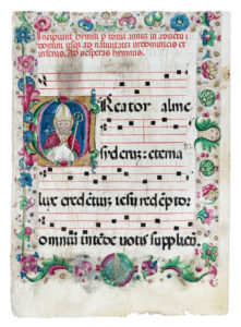 Manoscritto a inchiostro nero e rosso con notazione musicale. Foglio: 540x390 mm. Scrittura gotica. Specchio di scrittura: 390x280 mm. La lettera C miniata (125x130 mm) raffigura un vescovo con mitra e pastorale. Tempera e oro su pergamena. Al recto bordura di girari fitomorfi in blu, viola, rosa, verde, giallo e oro e al margine inferiore la raffigurazione di S. Francesco d'Assisi con le stigmate. 4 iniziali rubricate al verso in blu e rosso. Alcune tracce di uso e foglio tagliato al margine superiore (con parziale perdita di bordura). (1)Incipit: Creator alme siderum [...]. Si tratta di un inno proprio della liturgia, recitato o cantato durante i Vespri della prima domenica di Avvento. L'inno, che risale al VII secolo originariamente con le parole Conditor Amlme siderum [...], venne rivisto da papa Urbano VIII nel 1632, che introdusse alcune modifiche significative al testo. Nella versione riscritta assunse il titolo Creator alme siderum [...], testo presente in questo foglio.