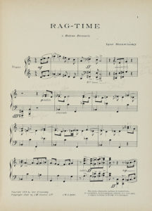 Spartito per pianoforte (340x270 mm). Pagine 12. Litografia. Minime tracce di restauro, ma carte ben conservate. (1)Strawinsky, affascinato dalla musica jazz, durante la Grande Guerra - fra il 1917 e il 1918 - scrisse Ragtime per undici strumenti: flauto, clarinetto, corno, cornetta, trombone, basso tuba, grancassa, due rullanti, piatti, cimbalom, due violini, viola, contrabasso. La composizione è in un unico movimento. Un'anteprima del brano, nella versione per pianoforte (quella qui presentata), venne data a Losanna l'8 novembre 1919, mentre la prima esecuzione della versione originale fu a Londra alla Aeolian Hall il 27 aprile 1920 (l'edizione venne stampata a Parigi, Sirène 1919). Il brano venne poi ristampato nel 1938: J.& W. Chester Ltd. London, e successivamente con l'indicazione editoriale Chester Music.