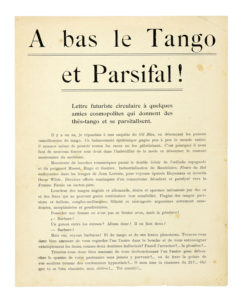 Marinetti Filippo Tommaso, A bas le Tango et Parsifal! Lettre futuriste circulaire à quelques amies cosmopolites qui donnent des thès-tango et se parsifalisent. Milano: Direction du Mouvement Futuriste, 11 Janvier 1914.