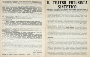 Marinetti Filippo Tommaso, Il teatro futurista sintetico. (Atecnico - Dinamico - Simultaneo - Autonomo - Alogico - Irreale). Milano: Direzione del movimento futurista, 11 gennaio 1915-18 febbraio 1915.
