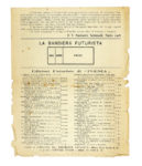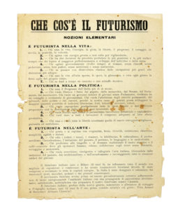 In-4° (mm 290x230). Carta [1]. Segno centrale di precedente piegatura, macchie e gravi strappetti marginali con mancanze e rare perdite di testo. (1)Manifesto pubblicato per la prima volta il 16 febbraio 1919 su Roma Futurista. Anno II, n. 7 e, nello stesso mese, su Dinamo. Rivista Futurista, Anno I, n. 1. Seguono tre versioni in volantino: la prima edizione (marzo 1919), in due differenti tirature: una con al verso la pubblicità per l'Esposizione Nazionale Futurista di Milano e l'indicazione di stampa 'Stab. Tip. Taveggia - Milano Via Ospedale 3'; l'altra per Roma Futurista e Dinamo (con indicazione di stampa 'Stab. Tip. Taveggia - Milano'); nel dicembre 1920, esce un'altra edizione (come la nostra) con significative varianti nel testo e il disegno de La Bandiera Futurista di Francesco Cangiullo al verso, che non compare nelle versioni precedenti. Futurismo. Gussago (BS): L'Arengario Studio Bibliografico, 2001,12; cfr. Futurismo (catalogo di vendita n. 100). Firenze: Libreria Salimbeni, 1991, 358.