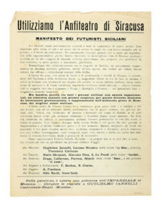 Utilizziamo l'anfiteatro di Siracusa. Manifesto dei futuristi siciliani. [Segue: Il Futurismo italiano nel 1921]. s.d.e. [i.e. 1921].