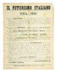 In-4° (mm 298x227). Carta [1]. Segno centrale di precedente piegatura, diffuse fioriture, strappetti marginali e una piccola mancanza centrale, con perdita di inciso. (1)Edizione originale, firmata dal folto gruppo dei futuristi siciliani, quali Jannelli, Nicastro, Carrozza, Shrapnel, Etna, Lo Presti, Drago, Calderone etc... che rielabora il raro volantino Manifesto futurista per le rappresentazioni classiche di Siracusa (distribuito in occasione della messinscena delle «Coefore» curata da E. Romagnoli a Siracusa, il16 aprile 1921). Al verso le notizie relative al Tattilismo, alla mostra d'avanguardia di Boccioni a Ginevra, all'Officina d'arte decorativa di Balla e di Depero, all'esposizione dei futuristi a Parigi, ai concerti degli Intonarumori al Théatre des Champs Elysées, alla pubblicazione de L'alcova dacciaio di Marinetti. Assente dai repertori specialistici consultati (che registrano solo l'edizione, di qualche mese seguente, con titolo Utilizziamo il teatro greco di Siracusa). Tonini, Manifesti, 162.2.