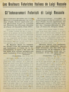 In-4° (mm 296x230). Carta [1]. Segno centrale di precedente piegatura e fioriture sparse. (1)Prima edizione di questo rarissimo rendiconto del concerto del 17 giugno a Parigi. Con due articoli di Montboron e di Henry Bidou, in francese e italiano. Echaurren Pablo, Futurismo. Collaudo 1909-2009 (catalogo di vendita). Milano: Libreria Antiquaria Pontremoli, 2009, 99: «In calce al testo indirizzi e numeri di telefono a Parigi e Milano per contattare gli Intonarumori.». Tonini, Manifesti 164.1; Salaris 88.
