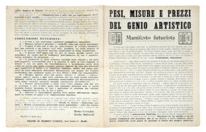 Corra Bruno [pseud. di Ginanni Corradini Bruno], Pesi, misure e prezzi del genio artistico. Manifesto futurista. Milano: Direzione del movimento futurista, 11 marzo 1914.