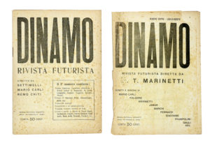 2 volumetti in-8° (mm 242x172). Comprende il n. 2 del Marzo 1919 e il n. 6 del Luglio-Agosto 1919. Pagine 32 ciascuno, con le opere di Balla in bianco e nero e con una tavola parolibera di Cesare Andreotti nel testo il primo, con le tavole a piena pagina nel testo di Prampolini, Galli, e altri il secondo. Diffuse fioriture; parzialmente slegato e con mancanze alle prime pagine e al dorso il secondo fascicolo. Esemplare da studio, non passibile di restituzione. (2)2 numeri (dei 7 che costituiscono l'intero pubblicato) di questo mensile diretto da Settimelli, Mario Carli e Remo Chiti, fino al n. 4, quando la guida passò al solo Marinetti. Pubblicato dal febbraio del 1919 al dicembre dello stesso anno, Dinamo affiancò Roma futurista come organo ufficiale del movimento, rappresentandone la controparte artistica, «[...] nei mesi in cui il movimento politico è in espansione e sospende le sue pubblicazioni prima [della] nascita della serie artistica 'Roma futurista'» (Echaurren Pablo, Futurismo. Collaudo 1909-2009 (catalogo di vendita). Milano: Libreria Antiquaria Pontremoli, 2009, 190). Tanti i contributi grafici e illustrativi di Lucio Venna, Giacomo Balla, Fortunato Depero, Enrico Prampolini e le numerose tavole parolibere originali di Benedetta Marinetti, Paolo Buzzi, Cesare Andreotti e molti altri. Cfr. Futurismo. Gussago (BS): L'Arengario Studio Bibliografico, 2001, 85.