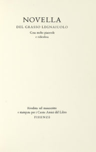 Novella del grasso legnaiuolo, cosa molto piacevole e ridiculosa a cura di Gianfranco Folena. [Firenze]: Cento amici del libro, [1965]. (Al colophon:) Verona: Officina Bodoni di Giovanni Mardesteig, 1965.