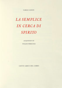 Gozzi Carlo, La semplice in cerca di spirito. Acqueforti di Tullio Pericoli. S.l.: Cento Amici del Libro (Pierluigi Puliti, Milano, e Alessandro Zanella, Verona), 2010.