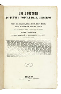Usi e costumi di tutti i popoli dell'universo, ovvero Storia del governo, delle leggi, della milizia, della religione di tutte le nazioni... Milano: Borroni e Scotti, (poi Libreria di F. Sanvito), 1856-1862.