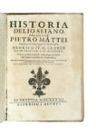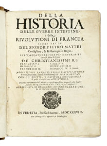 In-4° (289x215). Pagine XVI, 421, [3]. Marca tipografica in rame al frontespizio con il motto "Post fata resurgo". Testatine e finalini in legno nel testo. Ultimo fascicolo allentato, una gora d'acqua alle carte finali. Margini esterni di queste uiltime rovinati. Legatura in cartonato coevo con etichetta in carta al dorso. Mancanze al dorso e alle unghiature. Note di mano antica nel testo e alla prima e all'ultima carta. SI AGGIUNGE: Matthieu Pierre, Della historia delle guerre intestine e delle rivolutioni di Francia... In Venetia: presso il Barezzi, 1638. In-4° (mm 225x160). Pagine [36], 666, [2]. LEGATO CON: Id., Historia verace delle guerre seguite fra le due gran corone di Francia e di Spagna... In Venetia: presso il Barezzi, 1638. Pagine [16], 76, 28, 77, [3]. LEGATO CON: Id., Historia d'Elio Seiano... In Venetia: appresso i Giunti, 1637. Pagine [8], 99, [1]. Testatine, capilettera e finalini in legno nel testo. Bruniture concentrate ad alcune carte, fioriture sparse e gore d'acqua agli ultimi fascicoli. Legatura in piena pergamena molle con titoli manoscritti al dorso. Macchie ai piatti e mancanze al dorso. Nota di possesso di mano antica al foglio di guardia anteriore. (2)I OPERA: Cicogna 598: «Ottimo libro e di belle annotazioni fornito. L'originale latino non fu mai pubblicato. Osservò già il Foscarini che la storia del Valiero si aggira sopra massime di civile prudenza ridotte a pratica dimostrazione con esempli tolti dagli annali migliori, in che l'autore procede con metodo cronologico.»
