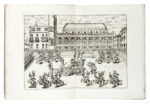 In-4° (mm 246x185). Pagine [4], 95-113, 1 bianca con 3 tavole calcografiche, di cui 2 a doppia pagina e 1 ripiegata, oltre a numerose illustrazioni, fregi e iniziali incise in rame e legno nel testo. Splendida copia, marginosa e fresca, con rare e lievissime fioriture a poche carte. Brossura coeva in cartonato marmorizzato. (1)Splendida edizione che illustra la festa del Corpus Domini vicentina. Per l'occasione erano istituiti tornei, banchetti e balli, una processione religiosa e una corsa di cavalli; la vera attrazione era però rappresentata dall'imponente Ruota alta cinquanta braccia, dedicata alla devozione della Santa Croce e raffigurata in una delle illustrazioni del volume. L'opera è completa e autonoma, seppur la sua paginazione inizi da p. 91. Berlin Kat. 3051; Lipperheide 2792; Ruggieri 821.