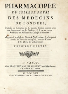 Pharmacopée du College Royal des medecins de Londres, traduite de l'Anglois [...] par le docteur H. Pemberton... Premiere (-seconde) partie. A Paris: chez Jean-Thomas Herissant, 1761-1771.