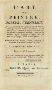 4 volumi in-8° (mm 197x127). Con, nel complesso, un'antiporta all'inizio del primo volume e 8 tavole fuori testo. Buono stato complessivo. Legatura coeva in cartonato con titoli in oro su tassello al dorso. SI AGGIUNGE: Watin, L'art du peintre, doreur, vernisseur [...] cinquième edition... A Paris: Rémond, 1802. (5)