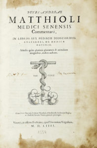 Mattioli Pietro Andrea, Commentarii in libros sex Pedacii Dioscoridis [...] Adiectis quam plurimis plantarum & animalium imaginibus... Venetiis: in officina Erasmiana, apud Vincentium Valgrisium, 1554.