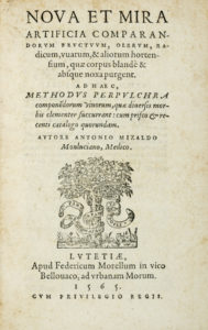 Mizauld Antoine, Nova et mira artificia comparandorum fructuum, olerum, radicum, uvarum, & aliorum hortensium, quae corpus blande & absque noxa purgent. Lutetiae: apud Federicum Morellum in vico Bellouaco, ad urbanam Morum, 1565.