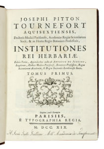 Tournefort (de) Pitton Joseph, Institutiones rei herbariae. Editio tertia. Appendicibus aucta ab Antonio De Jussieu [...] Tomus primo [-tertio]. Lugduni iuxta exemplar Parisiis e typograpia regia, 1719.
