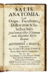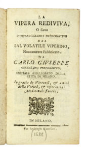 Compongono il lotto: 1) Gerenzano Portigliotto Carlo Giuseppe, La vipera rediviva. In Milano: per Ambrogio Ramellati, [s.d.]. In-12° (mm 155x85). Pagine 48. Copia in ottimo stato di conservazione con marca tipografica incisa in legno al frontespizio. Legatura in cartone con macchie ai piatti e titoli manoscritto al piatto anteriore. 2) Massa Antonio, Salis anatomia, in qua origo, facultates, differentiae...Wratislaviae: Andr. Franc. Pega, sereniss. & reverendiss. principi & episcopi typogr., aul [s.d.]. In-12° (mm 155x90). Pagine [16], 140, [2]. Qualche macchia al frontespizio, ma buone condizioni generali. Capilettera, testatine e finalini incisi in legno. Legatura coeva in piena pelle con qualche abrasione ai piatti e piccola mancanza alla cuffia superiore. 3) Nicander, Theriaka kai alexifarmaka. Nicandri Theriaca et alexipharmaca...Florentiae: ex Officina Mouckiana, 1764. In-8° grande (mm 205x135). Pagine [8], 376. Gora d'acqua al frontespizio e alle prime e ultime carte. Legatura in mezza pelle con tassello e fregi dorati al dorso. Qualche abrasione e macchia ai piatti. Ex libri al contropiatto anteriore. (3)