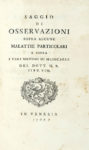 In-4° (mm 230x170). Pagine XXIV, [4], 214, [8] + 2 tavole in rame a piena pagina fuori testo. Marca editoriale in rame al frontespizio. Testatine, capilettera e finalini in legno nel testo. Fioriture concentrate ad alcune carte. Lieve gora d'acqua al margine superiore di tutto il volume. Lavoro di tarlo al margine interno dei primi fascicoli che non coinvolge il testo. Legatura in mezza pergamena con punte e piatti in carta decorata. Titoli manoscritti al dorso e tagli spruzzati. Ampia spellatura al piatto anteriore. SI AGGIUNGE: Rosa Michele, Saggio di osservazioni sopra alcune malattie particolari e sopra i vari metodi di medicarle... In Venezia: [s.e], 1766. In-8° (mm 224x140). Marca editoriale in rame al frontespizio. Tracce di foxing ad alcune carte. Allentato il primo fascicolo. Gora d'acqua al margine esterno dei primi e degli ultimi fascicoli. Legatura in cartonato decorato con titoli manoscritti al dorso. Piccolo taglio trasversale che coinvolge il margine inferiore di tutto il volume oltre al piatto anteriore. SI AGGIUNGE: Duprè de Lisle, Trattato delle malattie del petto conosciute sotto il nome di tise polmonale... Napoli: presso Giuseppe Maria Porcelli, 1778. In-8° (mm 175x111). Fioriture diffuse alle carte. Legatura in mezza pelle con punte e piatti in carta marmorizzata. Titoli e decori impressi in oro al dorso. Tagli gialli. (3)I OPERA: Angelo Nannoni (1715-1790) lavorò all'ospedale di Santa Maria Nuova a Firenze e fu un innovatore nel campo degli interventi chirurgici, famoso per aver affermato la necessità di operare subito i tumori. Quest'opera è, inoltre, molto interessante per la storia della chirurgia plastica: vi si trova infatti la descrizione del trattamento di una ferita, a seguito della quale il naso era stato quasi interamente staccato dal viso; a questo proposito Nannoni menziona il metodo di Taglicozzi. Blake 319.