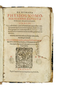 Della Porta Giovan Battista, De humana physiognomonia [...] Libri 4. Ursellis: typis Cornelii Sutorii, sumptibus Ionę Rosae Fr., 1601.