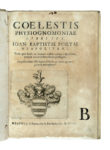 In-8° (mm 189x115). Pagine [16], 534, [58]. Frontespizio in rosso e nero con marca xilografica, numerose illustrazioni in legno nel testo. Carte intensamente brunite, con foxing e gore d'acqua. Frontespizio staccato ma presente, una bruciatura al margine esterno con parziale perdita di testo. Strappi con perdite alla carta 2A6. Legatura in mezza pergamena con punte, piatti in carta marmorizzata e titoli manoscritti al dorso. Fori di tarlo lungo dorso e cerniere. Mancanze alle unghiature. Timbri illeggibili di precedente collezione al frontespizio e alla carta )(6r. Esemplare da studio. SI AGGIUNGE: Id., Coelestis physiognomoniae libri sex... Neapoli: ex typographia Io. Baptistae Subtilis, 1603. In-4° (mm 257x181). Pagine [8], 191 [i.e. 187], [1]. Omesse nella numerazione le pagine 38-41. Assenti le carte G3, H2, K3 e X2-3. Stemma calcografico al frontespizio, testatine, fregi xilografici e belle illustrazioni in rame nel testo. Sporadiche fioriture alle carte, restauro con pecetta di carta al margine inferiore di carta a4. Piccoli lavori di tarlo ai margini interni del primo fascicolo. Annotazione manoscritta al contropiatto anteriore. Legatura in piena pergamena con titoli in oro su tassello in pelle al dorso. Timbro di precedente collezione al frontespizio. (2)I OPERA: Garrison-Morton 150 (per l'edizione del 1586): «Della Porta preceded Lavater in attempting to estimate human character by the features. He was the founder of physiognomy, and this is one of the earliest works on the subject.». Per la prima edizione: Heirs of Hippocrates 370; Durling 3720; Osler 3714.