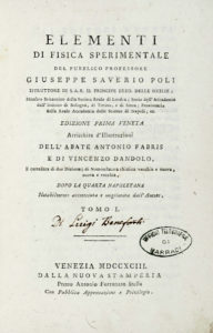 Compongono il lotto: 1) Poli Giuseppe Saverio, Elementi di fisica sperimentale [...] Tomo I (-VI). Venezia: Antonio Fortunato Stella (poi:) Antonio Curti q. Giacomo, 1793-94. 2) Id., Elementi di fisica sperimentale [...] Tomo I (-VI). Napoli: Gennaro de Turris, 1810. 3) Id., Elementi di fisica sperimentale [...] Tomo I (-V.). In Venezia: Andrea Santini, 1810. 4) Id., Elementi di fisica sperimentale [...] Tomo I (-V.). Venezia: Andrea Santini e figlio, 1819. 5) Id., Elementi di fisica sperimentale. [...] Tomo I (-V.). In Napoli: Angelo Trani, 1822.