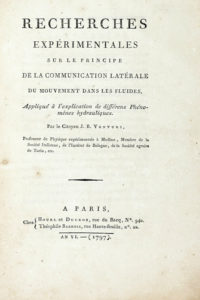 Venturi Giovanni Battista, Recherches expérimentales sur le principe de la communication latérale du mouvement dans les fluides... A Paris: chez Houel et Ducros, rue du Bacq, n. 940, Theophile Barrois, rue Haute-feuille, n. 22, 1797.