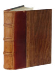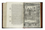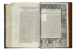 In-folio (mm 290x200). Carte 61, [1] bianca, 62-268. Segnatura: A-G⁶, H⁸, I-Z⁶, &⁶, cum⁸, 2A-2P⁶, 2Q⁸, 2R-2S⁶, 2T⁴. Presente la carta bianca K6. Spazi per capilettera con letterine-guida. Marca tipografica incisa in legno al recto dell'ultima carta. Frontespizio in ricca cornice xilografica, formata da quattro legni, con decorazione a candelabra, putti e figure mitologiche. Identica cornice a inquadrare quattro xilografie a piena pagina con i trionfi dei santi domenicani (carte I1r, L1r, Y1r, AA1r, SS1r) e la prima pagina di testo di ogni singolo libro (carte I2r, L2r, Y2r, AA2r, SS2r). Priva di cornice la xilografia a piena pagina alla carta A6v, con il trionfo di San Domenico. Esemplare parzialmente rifilato, con macchie sparse e restauri alle carte I6, Y1, 2A1, 2A6, 2Q2, 2R2, 2T3-2T4, alcuni dei quali integrativi. Legatura moderna in mezza pelle su assi di legno; dorso a tre nervi, leggermente abraso. Ex-libris in carta sciolto; vignetta xilografica con allegoria della libertà (Bononia docet) impressa su carta e applicata al contropiatto anteriore. (1)Rarissima prima edizione di una delle prime opere storiografiche dedicate all'Ordine dei Frati Predicatori, edita dal domenicano Leandro Alberti (1479-1552). La monumentale opera, dedicata al cardinale Niccolò Fieschi, riunisce le biografie dei più illustri membri dell'Ordine, dal fondatore Domenico ai grandi teologi del primo Cinquecento. Nella sua impresa editoriale Alberti si avvalse anche della collaborazione di umanisti e studiosi estranei all'ordine stesso, quali Giovanni Garzoni e Francesco da Castiglione. L'edizione rappresenta senza alcun dubbio uno dei grandi prodotti della tipografia bolognese dei primi decenni del XVI secolo, arricchita di eleganti cornici incise su legno, e sei xilografie eseguite con notevole cura, che illustrano, secondo un'iconografia diffusa, il trionfo dei massimi esponenti dell'Ordine Domenicano. La composizione delle scene ricorda quella dei Trionfi del Petrarca, con ogni domenicano seduto su un carro trionfale. EDIT 16 680; Mortimer, Harvard Italian 10; Sander 173; Adams A 469; BMC 14; Graesse I 52.