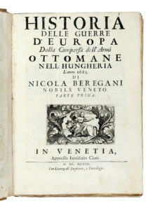 Beregan Nicolò, Historia delle guerre d'Europa dalla comparsa dell'armi ottomane nell'Hungheria l'anno 1683 [...] Parte prima (-seconda). In Venetia: appresso Bonifacio Ciera, 1698.