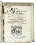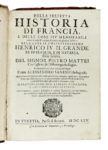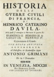2 volumi in-4° (mm 250x175). Pagine [12], 472, [28]; [2], 384, [34]. Assente l'ultima carta di entrambi i volumi. Invertiti i fascicoli Q e R del secondo volume. Antiporta calcografica e vignetta in rame ai frontespizi, capilettera in legno nel testo. Fascicoli iniziali lievemente allentati. Fioriture sparse alle carte. Pecetta di rinforzo al margine interno dell'antiporta del primo volume. Legatura in piena pergamena coeva con titoli manoscritti al dorso. Tagli spruzzati in rosso. Macchie ai piatti. SI AGGIUNGE: Guicciardini Francesco, La historia d'Italia [...] Riscontrata con tutti gli altri historici, & auttori, che dell'istesse cose habbiano scritto, per Tomaso Porcacchi... In Trevigi: appresso Fabritio Zanetti, 1604. In-8° (mm 204x147). Carte 22, [28], 488, 112. Vignetta xilografica al frontespizio. Bruniture concentrate ad alcune carte. Piccoli lavori di tarlo ad alcuni fascicoli che nopn coinvolgono il testo. Legatura in piena pergamena coeva con titoli manoscritti al dorso. Nota di possesso di mano antica al frontespizio. SI AGGIUNGE: Fiorelli Giacomo, Detti, e fatti memorabili del senato, e patritij Veneti... Venetia: presso Combi e La Noù, 1672. In-8° (mm 238x173). Pagine [12], 283, [17]. Vignetta xilografica al frontespizio, capilettera e testatine in legno nel testo. Esemplare in barbe. Prime 2 carte staccate ma presenti. Sporadiche fioriture. Legatura in pieno cartonato coevo con titoli manoscritti al dorso. Macchie ai piatti. Legatura staccata. Nota di possesso di mano antica al foglio di guardia e al frontespizio. SI AGGIUNGE: Davila Enrico Caterino, Historia delle guerre civili di Francia... In Venetia: per Domenico Lovisa, 1703. In-8° (mm 225x160). Testatine a capilettera in legno nel testo. Mancanza all'angolo superiore dell'occhietto, senza perdita di testo. Bruniture concentrate ad alcune carte, fioriture sparse. Legatura in piena pergamena coeva con titoli manoscritti al dorso. Tagli spruzzati in rosso. SI AGGIUNGE: Mattei Pietro, Della perfetta historia di Francia, e delle cose piu memorabili occorse nelle provincie straniere... In Venetia: presso il Barezzi, 1625. In-4° (mm 216x156). Capilettera, testatine e finalini in legno nel testo. Esemplare gorato, con fioriture sparse alle carte. Legatura in mezza pelle con punte e piatti in cartonato e titoli in oro impressi su tassello in pelle al dorso. Vistose mancanze alla cuffia superiore e alle unghiature. Punte stanche. (6)I OPERA: Unica edizione di questa opera non comune sulle guerre della Sacra Lega (Venezia, Austria e Polonia) contro gli Ottomani, dall'assedio di Vienna del 1683 alla caduta di Buda e Pest alcuni anni dopo.