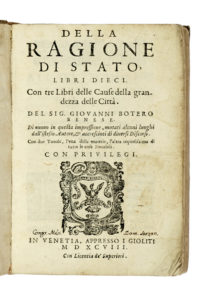 Botero Giovanni, Della ragione di stato, libri dieci. Con tre libri delle cause della grandezza delle città. In Venetia: appresso i Gioliti, 1598.