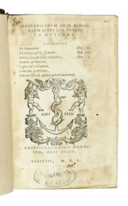 Cicero Marcus Tullius, Rhetoricorum ad C. Herennium Libri IIII. incerto auctore... Venetiis: Paulo Manutio, 1550.
