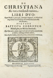 Codronchi Giovanni Battista, De christiana ac tuta medendi ratione libri duo. Opus medicis praecipue... Bononiae: Typis Clementis Ferronij, 1629.