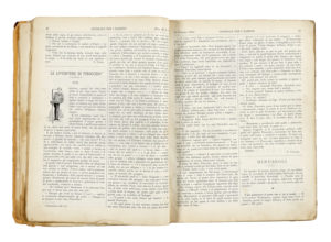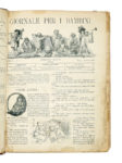 3 annate in 3 volumi in-4° (mm 290x205). Dal n. 1 dell'Anno I (7 luglio 1881) al n. 52 dell'Anno III (27 dicembre 1883). 130 fascicoli (rispettivamente 26, 52, 52) di circa 14-16 pagine ciascuno, con 2 tavole cromolitografie, a piena pagina fuori testo, nel primo volume. Moltissime illustrazioni, alcune anche a piena pagina. Frontespizio rimontato, con mancanze marginali. Al primo volume, vistose mancanze, rinforzi e strappi maldestramente restaurati con nastro adesivo principalmente ai nn. 1, 2, 5, 14, 19, 21, 23, 24 e 26. Al secondo le pagine 7-10 sono parzialmente staccate e riparate con il nastro adesivo trasparente; mentre molte pagine, principalmente ai nn. 2,3, 5, 9 10, 11, 22, 52 presentano strappi, rinforzi o mancanze; una macchia di inchiostro marginale ai primi fascicoli e una gora al margina superiore dell'ultima parte del volume. Strappi, mancanze e restauri con nastro adesivo a molte pagine, maggiormente concentrati ai nn. 1, 5, 7, 18, 19, 25, 27, 28, 33, 36, 44; sciolte, ma presenti, le pagine 469-477 che sono comunque presenti. Bruniture e altre mende a tutti e tre i volumi. Mancanti le pagine 15-16 al primo volume e le pagine 1-6, 143-146, 163-164, 173-174, 379-380, 785-786 e 817-818 al secondo. Legatura coeva in piena tela, con numerosi difetti, abrasioni e una grave mancanza ai piatti del terzo volume e alla cerniera del secondo. (3)«C'era una volta... — Un re! — diranno subito i miei piccoli lettori. — No, ragazzi, avete sbagliato. C'era una volta un pezzo di legno». Con il primo numero del Giornale per i bambini vide la luce La storia di un burattino di Carlo Collodi, suddivisa in 30 capitoli usciti in 26 numeri dal 7 luglio 1881 al 25 gennaio 1883. Il Giornale per i bambini è il primo periodico italiano destinato ai piccoli lettori, e venne pubblicato a partire dal luglio 1881 sotto la direzione di Ferdinando Martini, coadiuvato da Guido Biagi, annoverando fra i suoi collaboratori alcuni dei più apprezzati scrittori del tempo: Ida Baccini, Adolfo Bartoli, Luigi Capuana, Livia Capurro, Gabriele d'Annunzio, Giuseppe Giacosa e molti altri, ma soprattutto Collodi - che dall' '83 ne divenne anche il direttore; qui egli pubblicò la prima versione del suo celebre Pinocchio, «capolavoro immortale della letteratura dei ragazzi di ogni paese e di ogni lingua» (Collez. Zannerini 1). Racconta il Parenti, Rarità bibliografiche 138-140 che Collodi iniziò la stesura del suo romanzo per bambini a seguito dell'insistenza del Biagi, a cui scriveva inviando le prime 4 cartelle della Storia di un burattino: «Ti mando questa bambinata, fanne quel che ti pare, ma se la stampi, pagamela bene per farmi venir voglia di continuare». E in effetti la scarsa affezione iniziale dell'Autore per la sua storia ben traspare dall'intermittenza e dalle lunghe pause con cui apparivano le varie puntate, per di più accompagnate da figure di repertorio. Probabilmente senza le insistenze dei piccoli lettori, che iniziarono a inviare le loro letterine al Giornale e che in parte furono pubblicate nella rubrica 'La posta dei bambini', Pinocchio si sarebbe interrotto al XIV capitolo, nell'ottobre 1881. Invece nel marzo dell'anno successivo ricomparvero le avventure del burattino, questa volta anche con illustrazioni appositamente per la storia dal pittore Ugo Fleres, e seppur all'inizio con qualche interruzione «ripresa la penna, volò d'un fiato verso la conclusione: nel n. 4 dell'anno III, Pinocchio diventerà un bambino» (Parenti 147).