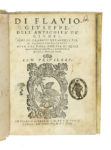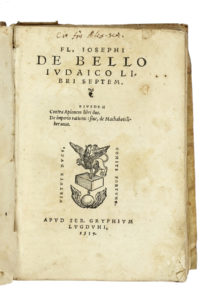 In-4° (mm 200x142). Pagine [36], 987, [1]. Marca xilografica al frontespizio. Testatine, capilettera abitati e finalini in legno nel testo. Fioriture sparse, alcune carte intensamente brunite. Lavoro di tarlo restaurato al margine interno delle carte O6-Q5; restauri al margine esterno delle carte F1, S4, T3 e all'angolo superiore di 3O6, con parziale perdita di testo alla carta 2L4, macchiata. Legatura in piena pergamena rigida con titoli e iniziali manoscritti al dorso. Alcune postille ai margini. Timbri di antica collezione al frontespizio. SI AGGIUNGE: Id., De bello Iudaico libri septem... Lugduni: apud Seb. Gryphium, 1539. In-8° (mm 173x130). Pagine 582. Assenti le ultime 16 pagine non numerate. Marca tipografica al frontespizio. Carte lievemente brunite. Fascicoli allentati. Gora d'acqua all'angolo superiore dei primi fascicoli, strappo restaurabile alla carta 2L3. Carta 2M4 parzialmente mutilata. Legatura in piena pergamena floscia con titoli manoscritti al dorso e al piatto anteriore. Dorso quasi interamente staccato. Tracce di legacci in pelle ai piatti. Dedica di mano antica alla sguardia anteriore. (2)I OPERA: Prime edizione, con la traduzione di Francesco Baldelli poeta e traduttore cortonese di autori latini e greci. Manca ad Adams.