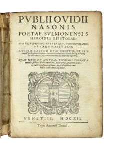 In-4° (mm 200x148). Carte [4], 268. Carte 266, 267 erroneamente numerate 256, 171. Marca tipografica al frontespizio. Capilettera, finalini e ampie testatine illustrate in apertura di ciascun capitolo, il tutto in legno. Carte uniformemente brunite con sporadiche fioriture. Piccolo lavoro di tarlo al margine interno dei fascicoli centrali, una gora d'acqua al margine esterno degli ultimi. Forellini di tarlo alle ultime carte, ampio restauro con pecetta di carta al verso del colophon. Legatura in piena pelle con titoli e decori in oro al dorso a 5 nervi. Tagli rossi. Mancanze alle cuffie. Note di possesso manoscritte al frontespizio, parzialmente cassate. SI AGGIUNGE: Id., Heroides epistolae, cum interpretibus... Venetiis: typis Antonij Turini, 1612. In-4° (mm 205x150). Carte [8], 159. Marca xilografica al frontespizio. Esemplare con gore e lavori di tarlo alle carte, in alcuni casi inficianti il testo. Legatura in piena pergamena molle con titoli manoscritti al dorso. Fori e iscrizioni manoscritte al piatto anteriore, parzialmente staccato. Annotazioni di mano antica al foglio di guardia posteriore. (2)I OPERA: Si veda Brunet IV, 294 per altre edizioni.