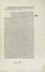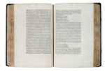 In-folio (mm 335x228). Carte [244]. Segnatura [a–c10, d14, e–h8, i k10, l–n8, o6, p4, q12, r8, s10, t-u8, x10, y-z⁸, A8, B–D6, E12, *4]. Testo in carattere romano su 47 linee. Spazi per capolettera. Opera contenente i soli Trionfi. Gore marginali a quasi tutto il volume; alcuni piccoli fori di tarlo, che in alcuni casi coinvolgono il testo, e diffuse tracce di foxing. Legatura coeva in piena pelle, su assi di legno, con fregi a secco ai piatti e i resti di quattro fermagli a quello posteriore; sguardie in pergamena successiva. Abrasioni, qualche mancanza ai piatti e al dorso e forellini di tarlo sparsi, ma nel complesso buone condizioni. Firma in calce Jacopo Serzelli alla prima carta; due ex-libris al contropiatto. (1)Una bella edizione della prima apparizione del commento di Bernardo Lapini per i Trionfi, stampata da Annibale Malpighi (forse insieme al libraio Sigismondo de' Libri, la cui bottega ne conteneva ancora alcune copie nel 1484) e originariamente pubblicato insieme al Canzoniere (elencato separatamente da GW ma insieme da ISTC). La legatura è verosimilmente bolognese, anche se il De Marinis 1442, assegnato a Ferrara, ha un disegno molto simile. Speck, Bibliotheca Petrarchesca, 159; cfr. Brunet IV, 540; Goff P380; BMC VI 811.