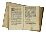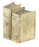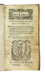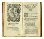 2 parti in 1 volume in-12° (mm 132x70). Pagine 490, 2 bianche; 259, [3]. Ciascuna parte con proprio frontespizio, numerose illustrazioni xilografiche nel testo, incluso un ritratto di Laura e Petrarca a carta A7v. Copia con sporadiche macchie e alcune gore, assente l'ultima bianca della seconda parte. Legatura in piena pergamena con titoli manoscritti al dorso. Mancanze lungo le cerniere. SI AGGIUNGE: Id., Il Petrarca con nuove spositioni, nelle quali, oltre l'altre cose, si dimostra qual fusse il vero giorno & l'hora del suo innamoramento... In Lyone: appresso Gulielmo Rovillio, 1574. 2 parti in 1 volume in-16° (mm 115x72). Pagine [48], 19-558 [i.e. 588], [50], 4 bianche; 294, [9], 1 bianca. Alcune leggere bruniture, sporadiche macchioline, buona copia solo leggermente corta di margini. Legatura coeva in piena pergamena con titolo manoscritto al dorso. Legatura parzialmente staccata. (2)I OPERA: Buona edizione collettiva del Petrarca per i torchi Bevilacqua. Marsand p. 76: «Bench'essa non sia che una copia della edizione pubblicata dal Rovillio [...] può stimarsi più pregevole di quella, sì per la maggiore diligenza usata nella correzione, che per la maggiore nitidezza dei caratteri». II OPERA; Marsand p. 82.