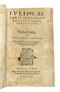 Scaliger Iulius Caesar (Bordoni Giulio), Exotericarum exercitationum Liber XV. De Subtilitate, ad Hieronymum Cardanum. Francofurti: Apud Andreae Wecheli heredes Claudium Marnium et Ioann. Aubrium, 1592.