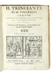 In-4° (mm 198x145). Carte [4], 122, [14], 123- 310. Marca xilografica al frontespizio, ritratto dell'autore a carta a4v e 14 carte di illustrazione xilografica di utensili per cucinare, cucine e banchetti. LEGATO CON: Cervio Vincenzo, Il trinciante. In Venetia: appresso Alessandro Vecchi, 1604. Carte [4], 39. Lieve gora nel margine superiore dei fascicoli, altra gora più evidente negli ultimi fascicoli del volume, copia leggermente corta di margini, ma completa. Legatura coeva in piena pergamena floscia con titolo manoscritto al dorso. Alcune piccole mancanze in corrispondenza della cuffia superiore. Note di possesso manoscritte nella carta di guardia anteriore. (1)Prima edizione collettiva delle Opere dello Scappi e del Trinciante del Cervio, entrambi con legni raffiguranti banchetti, stoviglie e utensili per il taglio della carne e del pesce. Lo Scappi può considerarsi tra i più importanti testi di cucina rinascimentali, complice sicuramente la fama dell'Autore, che fu cuoco personale di numerosi cardinali e due papi; il Cervio, uno dei trattati sul taglio della carne e del pesce più famosi del XVI secolo. Vicaire, 772-773; Bitting, 418-419 (Scappi) e 81 (Cervio).