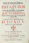 Compongono il lotto: 1) Terceira, Estatutos da Veneravel Ordem Terceira da penitencia... Lisboa: na officina de simao Thaddeo Ferreira, 1787. 2) Tratado de amizade, navegaçao, e commercio entre as muito altas... Lisboa: na regia officina typografica, 1789. 3) Definiçones et estatutos dos cavalleiros e freires da ordem de nosso senhor Jesus Christo... Lisboa: na officina de Miguel Manescal, 1746. 4) de Vertot Abbé M. Révolutions de Portugal [...] nouvelle edition. Paris: Belin, 1792. 5) Conego Joaquim Maria Lourenco, Situacao juridica da Igreja em Portugal. Coimbra editora, 1943. 6) Album comemorativo da exposicao de estampas antigas sobre Portugal por artistas estrangeiros dos seculos XVI a XIX. Lisboa: Museus Nacionais de arte antiga, 1944. 7) Compendio Historico do estado da universitade de Coimbra... Lisboa: na regia officina typografica, 1772. 8) Leitao Joaqim, Annales Politicos da la Republica portoguesa (1910 – 1911). 1911. 9) Portugal e A Santa sé, Concordata e acordo missionario de 7 de Maio de 1940. 10) Smith John, Memorias do Marquez de Pombal. Lisboa: Pereira, 1872. 11) Ferreira Antonio, O casamento segundo a Concordata. Lisboa, 1942. 12) Camoens Luis de, Lusiadas de Luis de Camoens. Lisboa: Na Typografia Lacerdina, 1805. 2 volumi. (13)