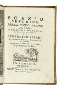Compongono il lotto: 1) Cicero Marcus Tullius, L'epistole ai famigliari in volgar Toscano recate [...] per Alessandro M. Bandiera. Tomo primo (-terzo). In Venezia: presso Giacomo Storti, 1793. 3 volumi. 2) Boethius Anicius Manlius Torquatus Severinus, Della consolazione della filosofia tradotto da [...] Benedetto Varchi. In Venezia: appresso Francesco Piacentini, 1737. 3) Xenophon, Ephesiacorum Libri V. De Amoribus Anthiae et Abrocomae. Londini: typis Gulielmi Bowyer, 1726. 4) Justinianus, Institutionum libri IV. Patavii: typis Seminarii, 1736. 5) Vergilius Maro Publius, Opera. Patavii: ex typographia Seminarii, 1751. 6) Fedro, Le favole. Edizione quarta. In Venezia: appresso Francesco Pitteri, 1762. 7) Da Pressano Gianpio, La vita molle disaminata in sei lettere. In Roma: per Ottavio Puccinelli, 1759. 8) Calbi Ruggero, La filosofia morale esposta in sonetti. In Ravenna: per Anton Maria Landi, 1723. (10)