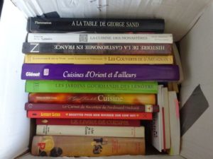 Mannette 30 contenant : 18 livres de gastronomie dont À la table de George Sand. Voir photo.