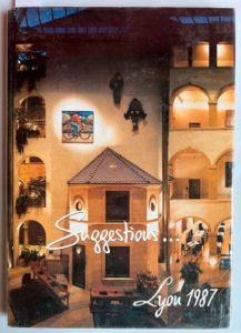 ANONYME. Suggestions… Lyon 1987. Lyon, Mairie de Lyon, Office du Tourisme, 1987 ; in-folio, environ 100 pp., reliure pleine toile avec jaquette illustrée. Ouvrage sur les grands restaurants de Lyon et des environs. Illustré de publicités et de menus des princes de la gastronomie lyonnaise. Rare.