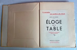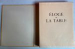 [BAILLE] - SAINT-GEORGES. Éloge de la table. S.l., Édité spécialement pour la confrérie des chevaliers du tastevin, 1947 ; in-4, 211 pp., broché en feuilles, couverture rempliée, emboîtage. Exemplaire numéroté (tirage à 500 exemplaires) - Préface de Curnonsky. Illustrations originales d'Hervé Baille.