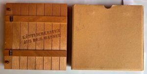 BLANK (Hans W) - Höstlichkeiten aus dem Wasser. Berlin, Mary Hahns, 1966 ; in-8, 130 pp., reliure en bois d'une maquette originale faisant un peu penser aux maquettes d'Odette Ducare pour Robert Morel, emboitage en carton. Recettes de poissons en allemand.