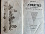 BURNET. Dictionnaire de cuisine et d'économie ménagère par Burnet ex-officier de bouche à l'usage des maîtres et maîtresses de maison, fermiers, maîtres d'hôtel, chefs de cuisine, chefs d'office, restaurateurs, pâtissiers, marchands de comestibles, confiseurs, distillateurs etc. » Contient l'explication de tous les termes techniques, les divers procédés employés dans la haute, moyenne et petite cuisine, les menus de repas, la manière de dresser les plats et de disposer les différents services, l'art de découper, l'art du pâtissier, confiseur et du distillateur, les meilleurs moyens à employer pour la conservation des aliments de toute nature, la manière de reconnaître la bonne ou la mauvaise qualité des aliments soit solides soit liquides et de toutes les substances qui servent à l'alimentation, des observations hygiéniques sur la nature des aliments et sur ce qui regarde leur préparation, les parties les plus intéressantes de l'histoire de la cuisine, les soins à donner à la cave, la manière de faire tous les vinaigres connus. Paris, A la librairie Usuelle, 1836 ; in-4, IV-788 pp., relié demi-maroquin brun, dos orné à 5 nerfs, couverture conservée, tranches jaspées. 11 planches. Imprimé sur deux colonnes et avec de nombreuses gravures dans le texte. Édition originale.
