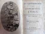 DELILLE (Jacques) - La gastronomie ou l'homme des champs à table. Pour servir de suite à l'Homme des Champs. Paris, Chez Giguet et Michaud, 1803 ; in-12, frontispice, 176 pp., relié demi-cuir, coloris terre de Sienne naturelle, dos lisse orné, tranches jaspées. L'abbé Jacques Delille, né en Aigueperse en 1738, mort en 1813, fit ses études à Paris. Il se distingua en traduisant "les Géorgiques" de Virgile et fut élu à l'Académie Française et au Collège de France. Pendant la Révolution française, il « s'exila » à Saint-Dié, puis partit ensuite pour la Suisse, l'Allemagne et l'Angleterre. Il rentra en France, en 1802.