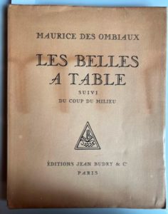 DES OMBIAUX (Maurice) - Les belles à table. Suivi du Coup du milieu. Paris, Éditions Jean Budry & Cie, 1926 ; in-4, 102 pp., broché, couverture rempliée. Frontispice de Marie Laurencin. Un des 400 exemplaires numérotés.