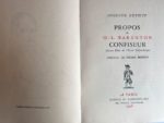 DETOEUF (Auguste) - Propos de O.-L. Barenton Confiseur, ancien élève de l'École Polytechnique. Paris, Éditions du Tambourinaire, 1958 ; grand in-8 carré, 232 pp. + 6 pp. d'extrait du catalogue, reliure plein maroquin à bande rouge et brun, dos à 4 nerfs, titre frappé or, plats mosaïqués, couverture conservée, tête dorée. Préface de Pierre Brisson. Recueil d'essais, de propos, de lettres, de pastiches et d'aphorismes.
